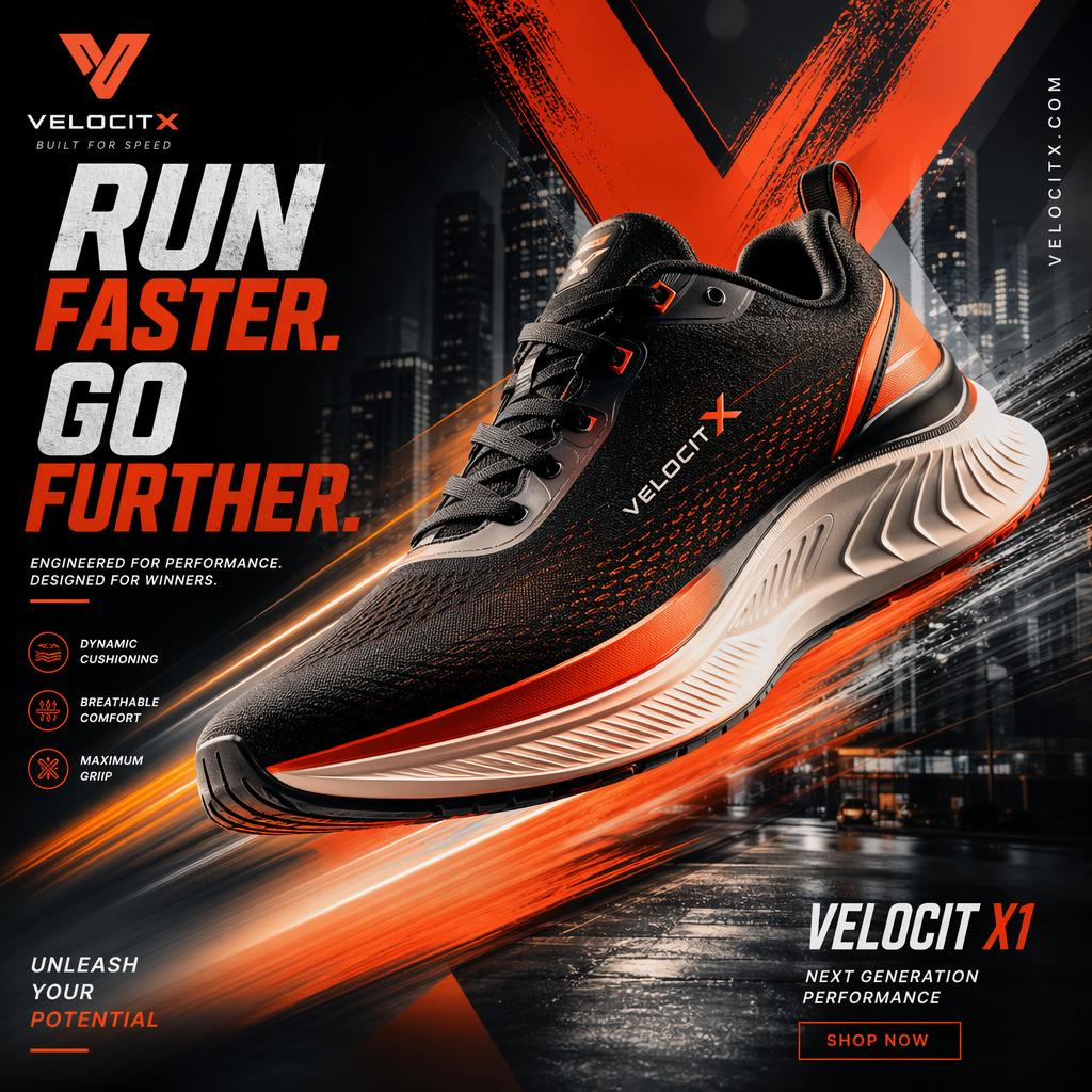 Modern promotional poster for a sports shoe brand, dynamic composition, bold typography, high contrast lighting, motion blur effect, vibrant colors, urban streetwear aesthetic, clean layout, commercial advertising style