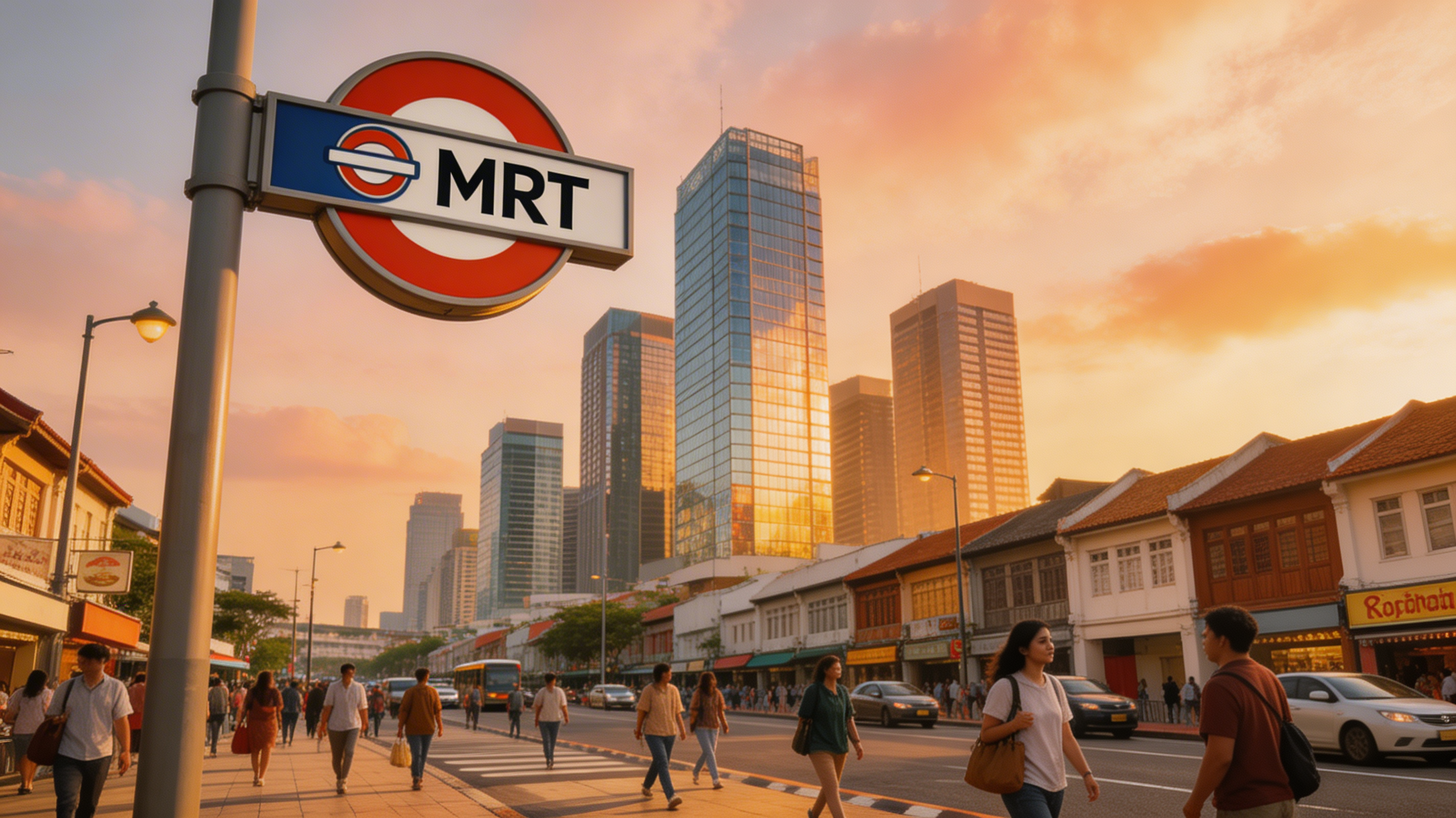 Prompt: A busy street scene in Singapore with MRT signage, modern buildings, pedestrians walking, warm sunset lighting, realistic environment, high detail